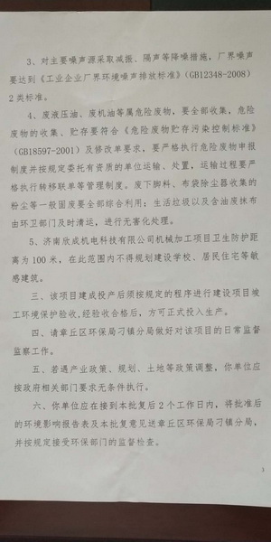 濟南欣成機電科技有限公司(環(huán)評批復)